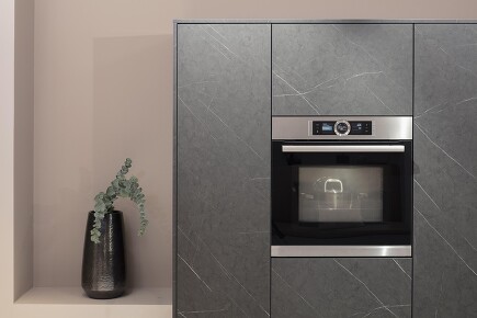 Der Trend zum Schwarz hält an und sorgt dafür, dass auch die Gerätehersteller möglichst viel schwarz gestalten, das früher noch silbern hervorblitzte: Ehemalige Edelstahlelemente werden entweder durch schwarze ersetzt oder weggelassen und kommen mit griffloser Gestaltung aus, bei der sich Gerätetüren durch Antippen oder auf Zuruf öffnen. Letzteres hilft, Fingerabdrücke zu vermeiden, denn gerade wenn die Ausführung in Schwarzglas erfolgt, werden sie störend sichtbar.