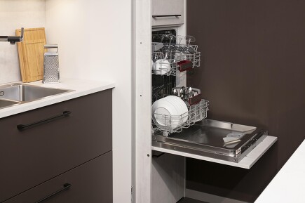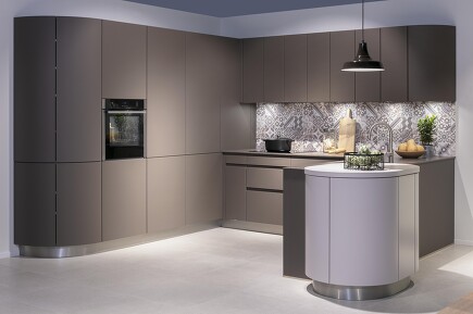 Das matte Havannabraun sieht in Kombination mit silbernen Sockelleisten und dem magnoliaweißen Abschlussschrank erst recht edel aus – schön angestrahlt von der schwarzen Retro-Hängelampe. Der helle glatte Fliesenboden und die blaue Zimmerdecke vollenden die Farbgestaltung. Auch die grifflose Ausführung passt perfekt zu diesem Design und ist zusätzlich besonders pflegeleicht. Sämtliche Küchenschränke öffnen sich nach leichtem Druck mit Knie, Hand oder Ellenbogen.